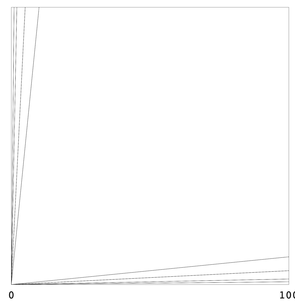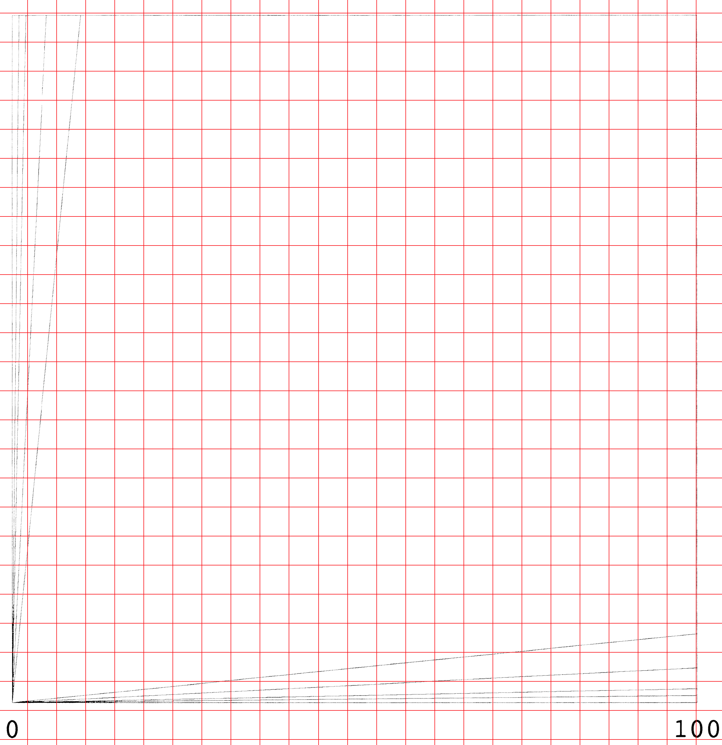 Ich habe also ein Testmuster entworfen, welches ein Quadrat mit Kantenlänge 100 mm zeichnet. Zusätzlich vier Linien, welche vom Nullpunkt in der linken unteren Ecke des Quadrats bis zur rechten vertikalen Begrenzung um 1, 2, 5 und 10 mm nach oben ansteigen. Zusätzlich habe ich vier weitere Linien angefordert, welche vom Nullpunkt in der linken unteren Ecke bis zur oberen horizontalen Begrenzung um 1, 2, 5 und 10 mm nach rechts abweichen. Das Testmuster sieht damit so aus: