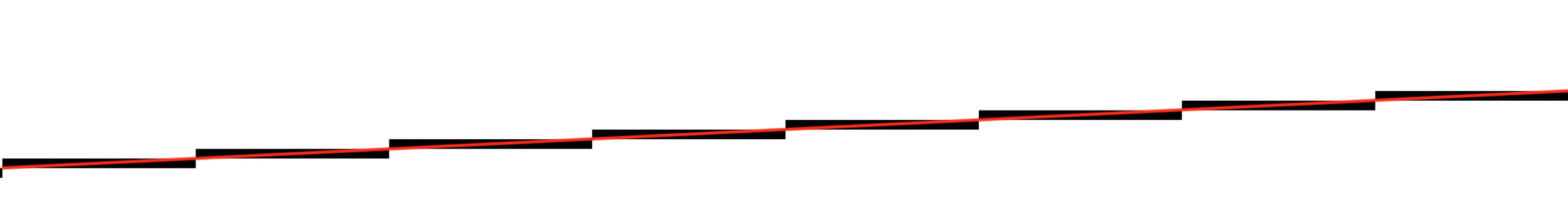 600 dpi bedeutet, dass ein Gerät auf einer Strecke der Länge 1 inch (=Zoll) 600 diskrete dots unterbringen kann. Daraus folgt, dass ein einzelner dot nur winzige 0.0423 mm lang/breit ist. Ganz schön klein. So klein, dass meine gealterten Augen eine gute Lupe benötigen, um derart feine Details auszumachen. Aber um das Vorhandensein derart feiner Strukturen nachzuweisen, muss ich zum Glück nicht einzelne dots identfizieren. Es genügt, aus der Betrachtung eines geeigneten Testmusters auf das Vorhandensein derart feiner Strukturen schliessen zu können. Ein geeignetes Prüfmuster ist z.B. eine gerade Linie, deren Neigung nur minimal von der Rasteranordnung (horizontal, vertikal) des betrachteten Geräts abweicht. Hier kann (bzw. wird) man unweigerlich auf den Treppeneffekt stossen. Der Treppeneffekt bewirkt, dass eine z.B. flach gegenüber der Horizontalen geneigte Gerade bei Ausgabe auf einem Rastergerät durch abschnittweise horizontale Geradenstücke angenähert wird. Dabei weisen bennachbarte horizontale Geradenstücke eine Treppenstufe von exakt der Höhe von einem (1) dot auf. Wenn die Testgerade lang genug ist, wird man an ihr in regelmässigen Abständen derartige Treppenstufen beobachten können, etwa so: