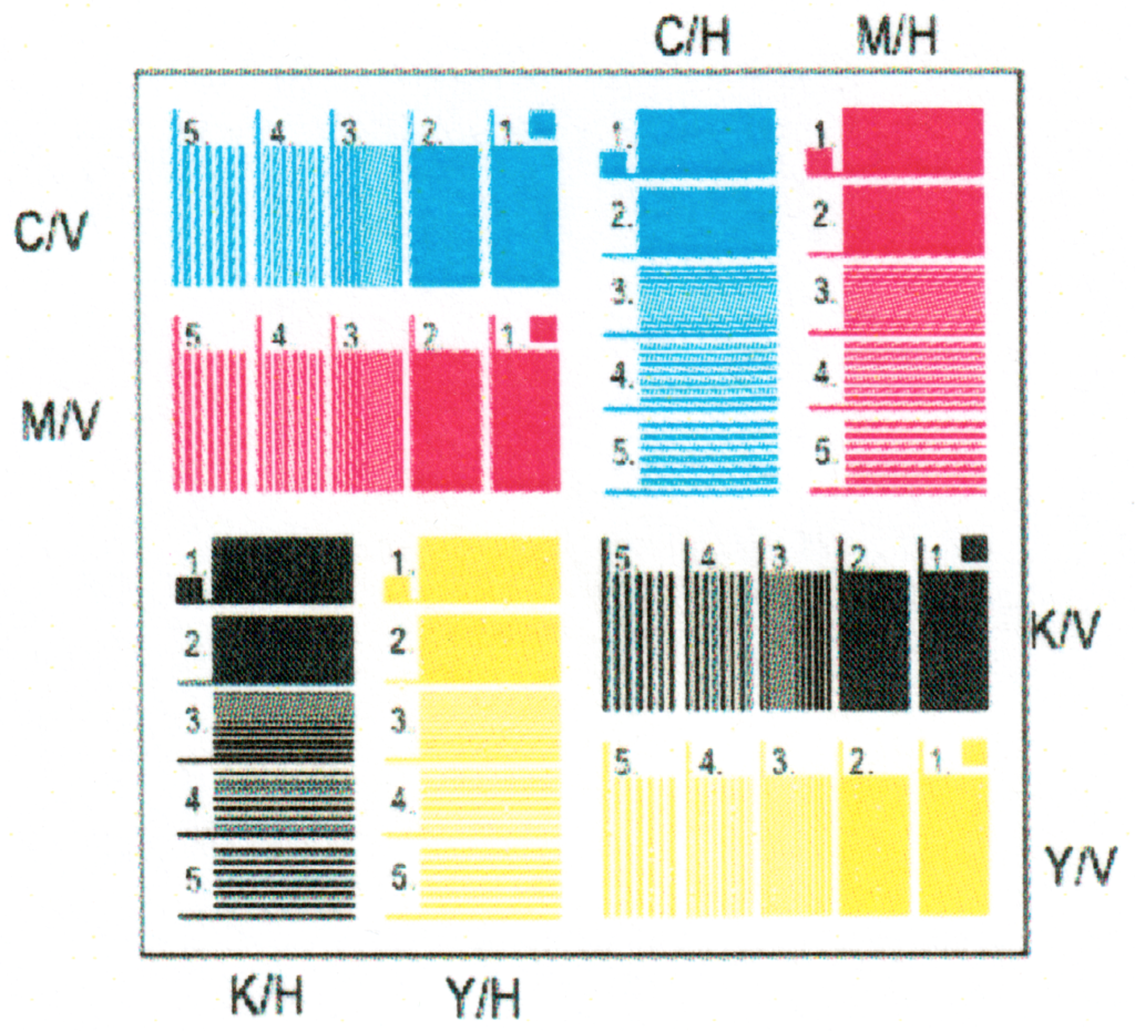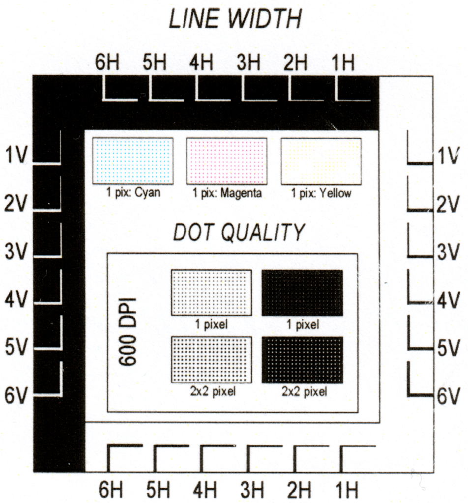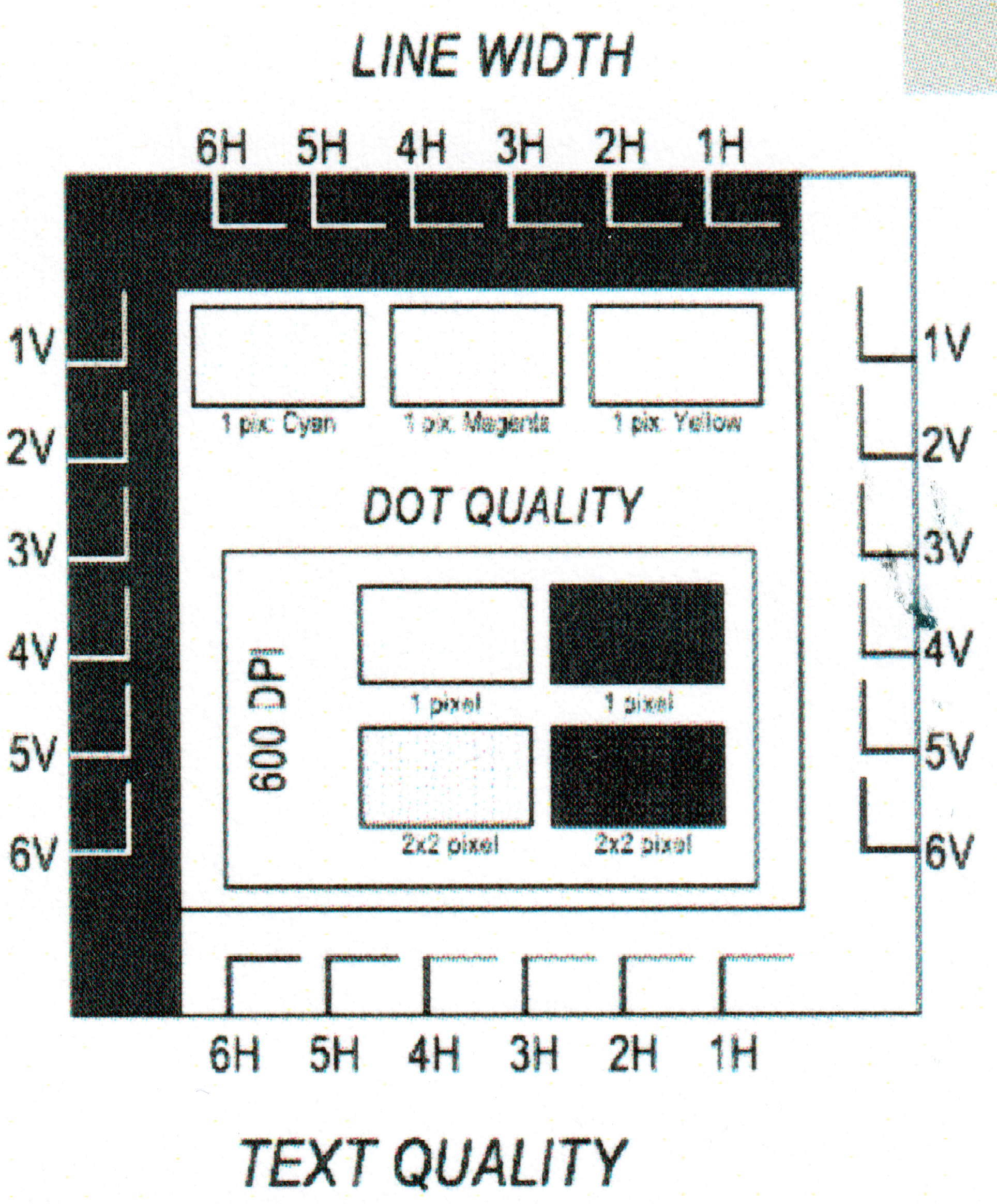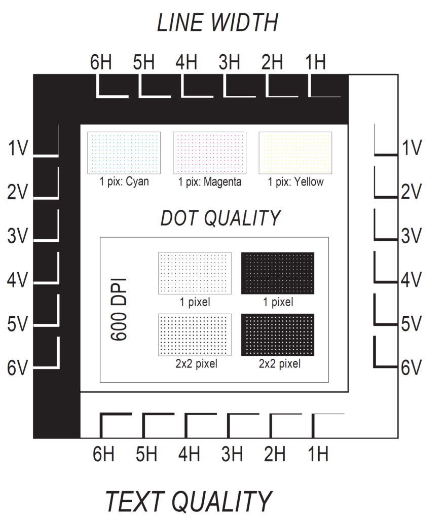 Im umlaufenden Bereich wird die Linienqualität getestet. Und zwar im linken, oberen Bereich als weiss auf schwarzem Untergrund, und im rechten unteren Bereich als schwarz auf weissem Untergrund. In der Mitte die Punktqualität. Zuoberst farbige Punkte, dann darunter ein Raster aus schwarzen Punkten auf weissem Untergrund, sowie rechts daneben ein Raster aus weissen Punkten auf schwarzem Grund.