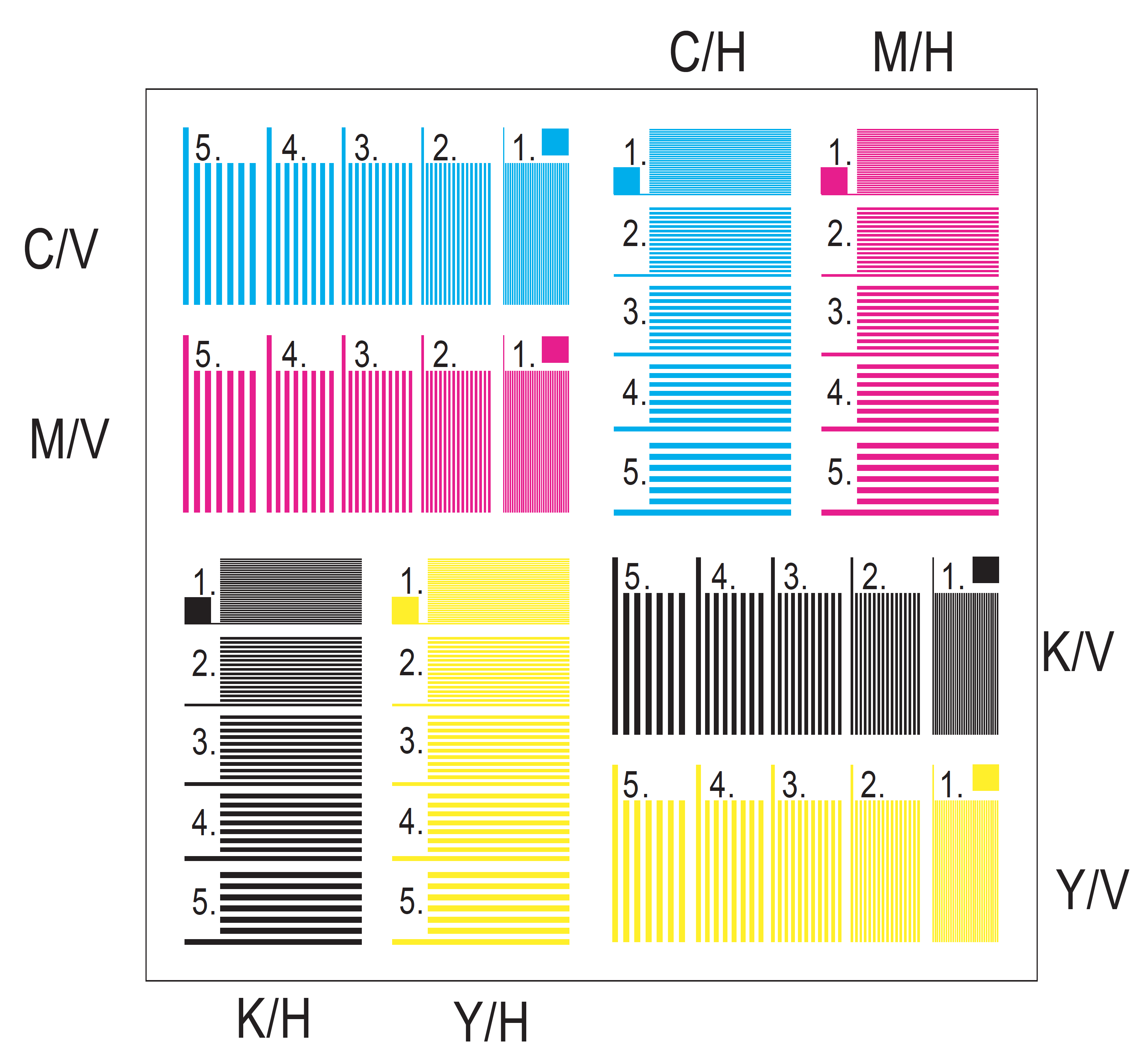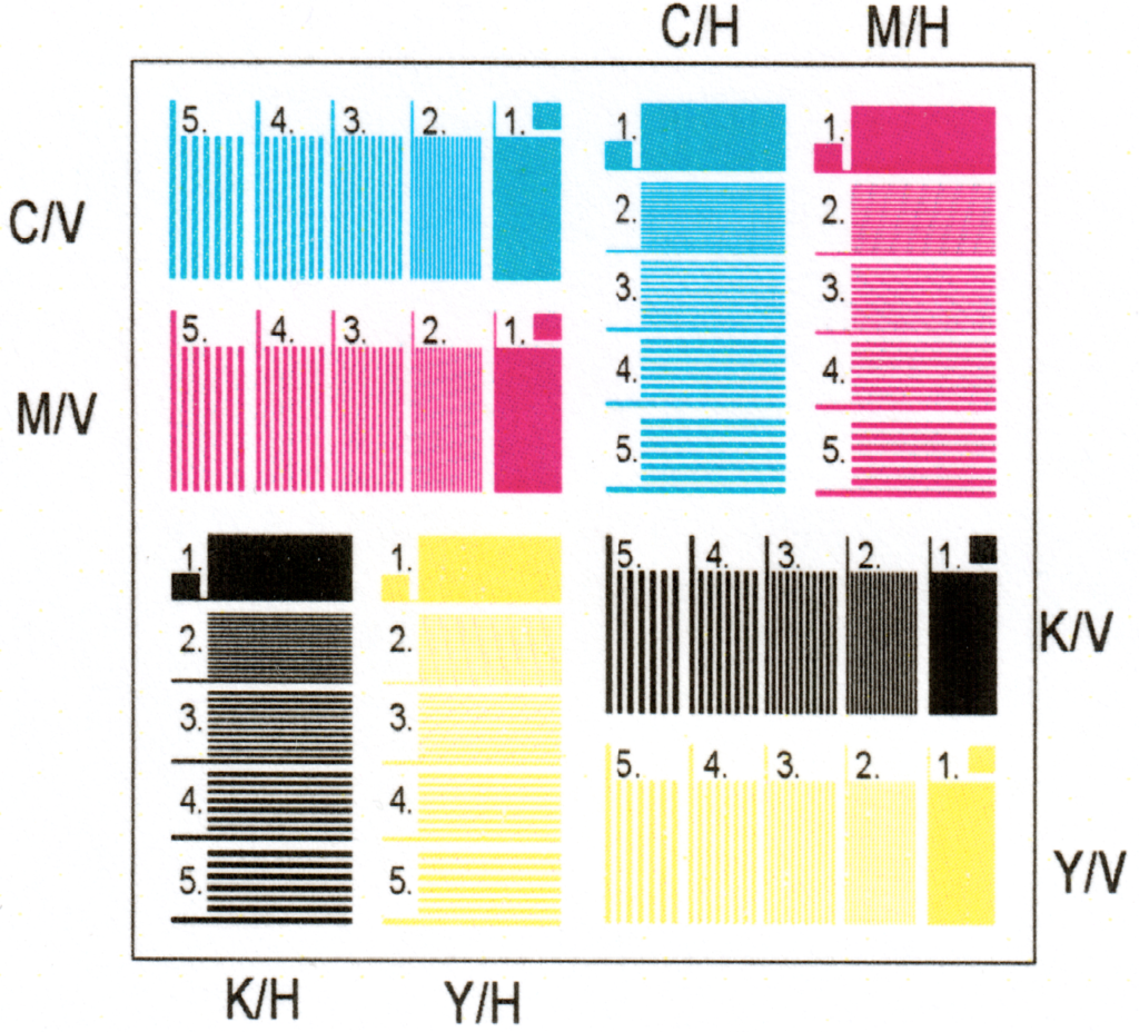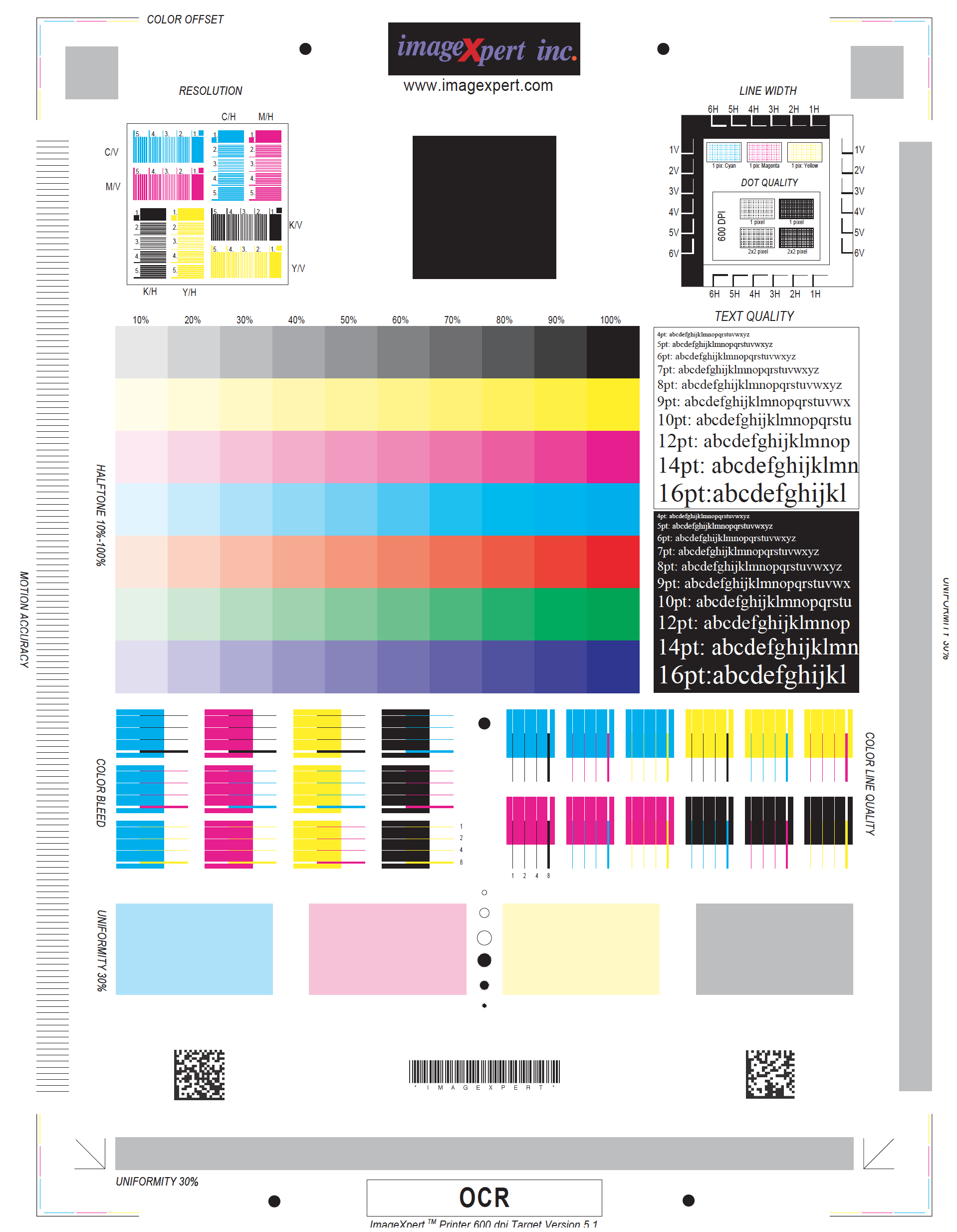 Im umlaufenden Bereich wird die Linienqualität getestet. Und zwar im linken, oberen Bereich als weiss auf schwarzem Untergrund, und im rechten unteren Bereich als schwarz auf weissem Untergrund. In der Mitte die Punktqualität. Zuoberst farbige Punkte, dann darunter ein Raster aus schwarzen Punkten auf weissem Untergrund, sowie rechts daneben ein Raster aus weissen Punkten auf schwarzem Grund.