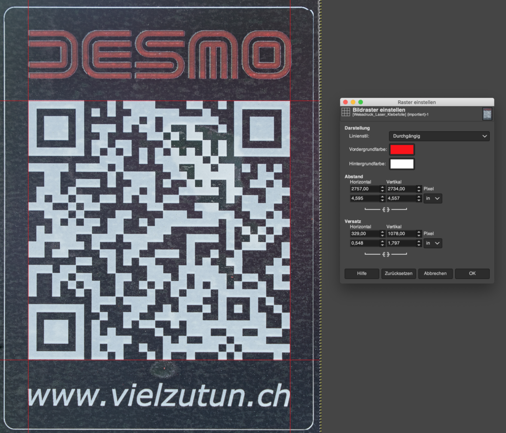 Da das Motiv einen 33 x 33 Module umfassenden QR-Code enthält, war es leicht, anhand der vorstehend konfigurierten Rasterabmessungen für den gesamten QR-Code die Rasterteilung für einzelne Module zu konfigurieren, nämlich: den vorstehend ermittelten Rasterabstand für jede Achse durch 33 teilen.