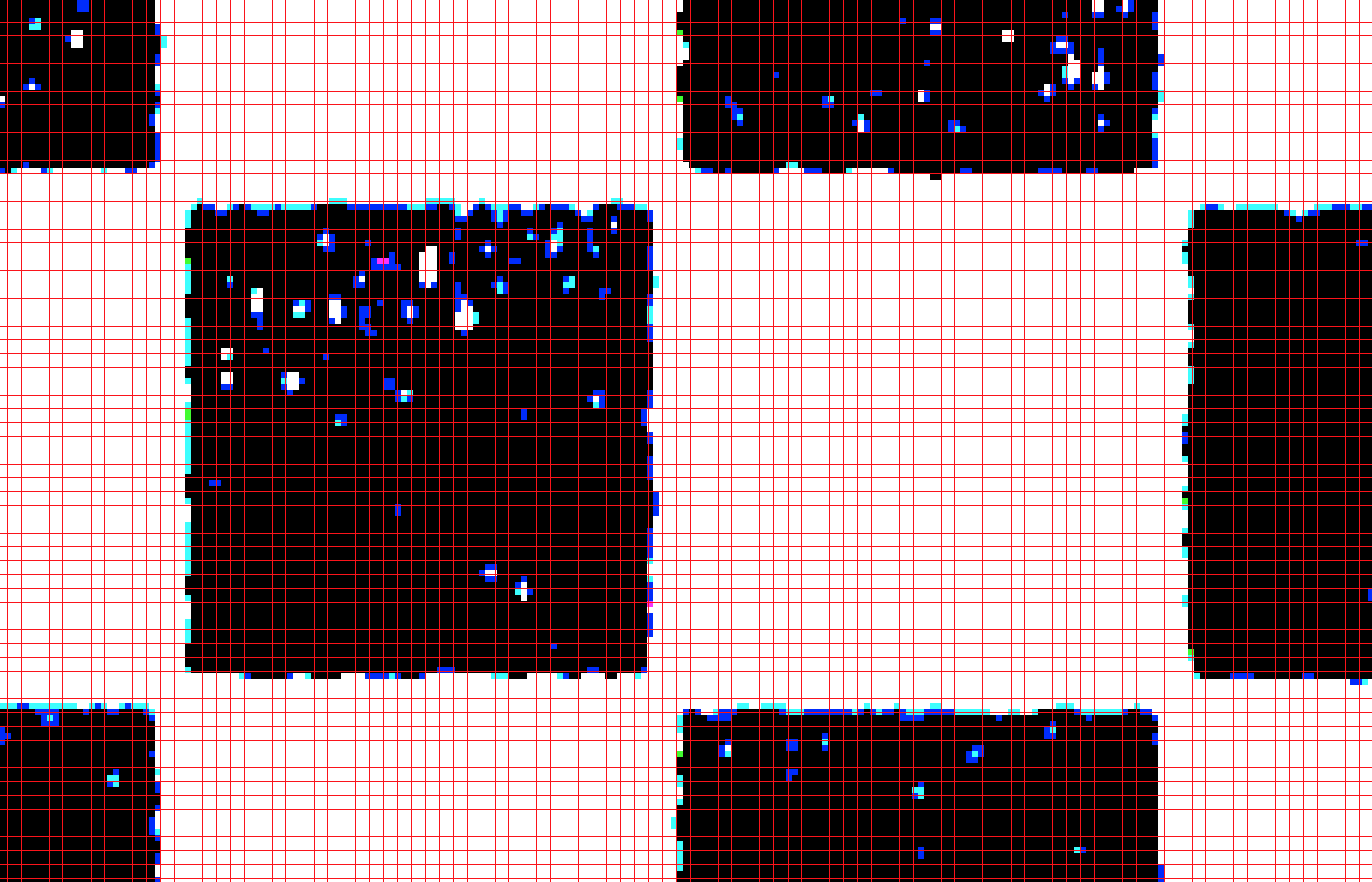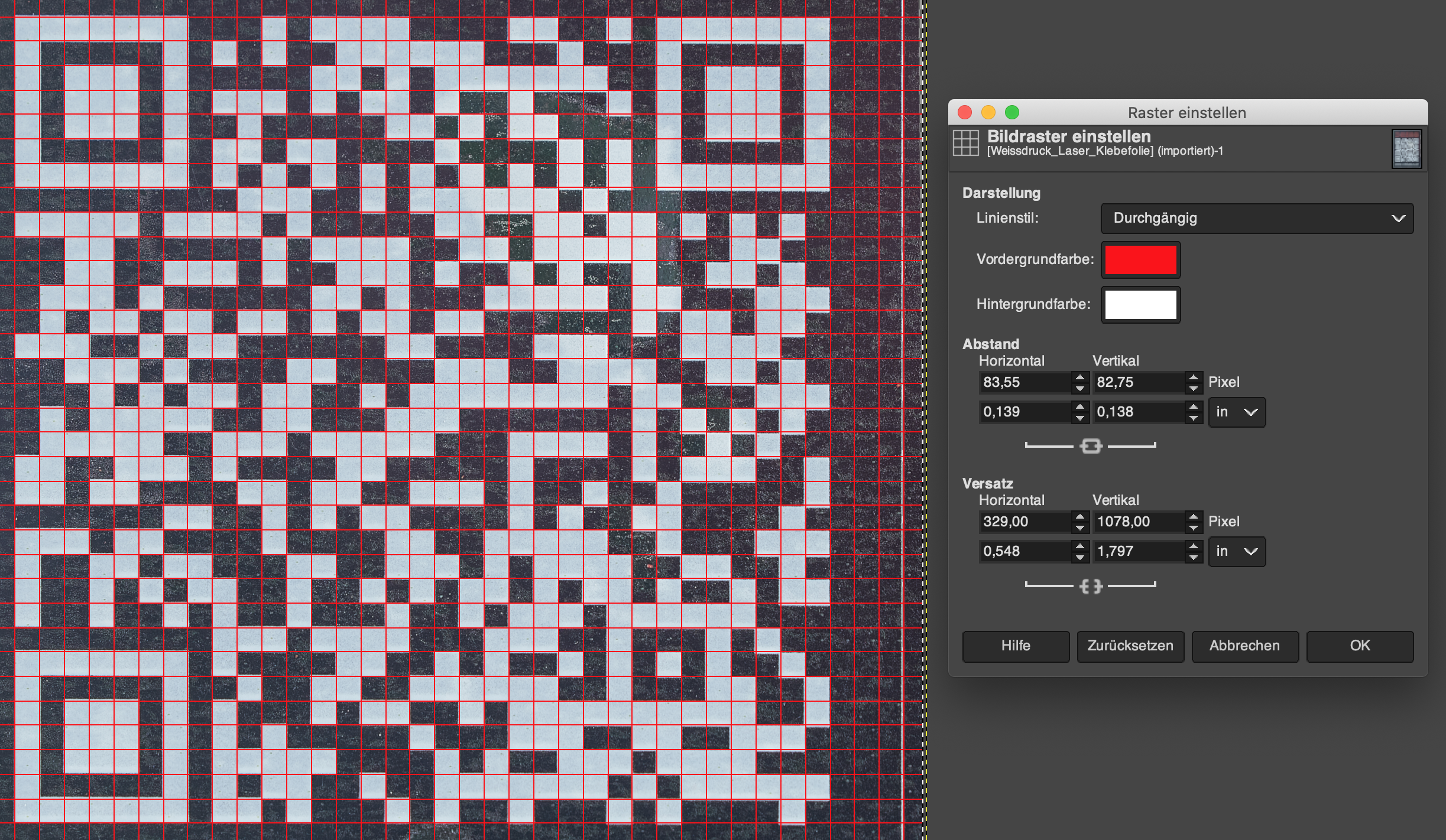 Und da, wie im vorigen Beitrag, ein einzelnes Modul bei 600 dpi durch 36 x 36 Drucker-Dots abzubilden war, konnte ich entsprechend ein Raster konfigurieren, welches einzelne Drucker-Dots pro Rasterzelle abbildet, nämlich: den vorstehend ermittelten Rasterabstand für jede Achse nochmals durch 36 teilen.