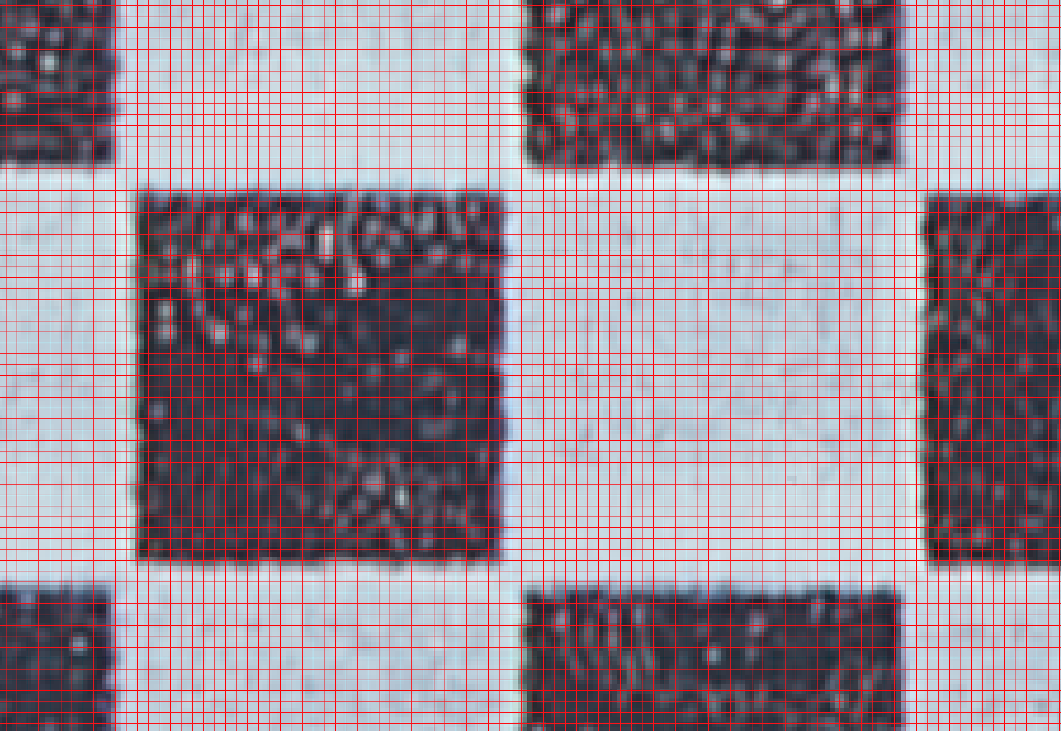 Das Testmuster habe ich dann bei 100% Grössen-Skalierung mit 600 dpi ausgedruckt (das Muster war dabei im Ausdruck wirklich 100 mm x 100 mm gross) und habe es mit dem Flachbett-Scanner unseres Multifunktionsgeräts bei 1’200 dpi (einen schönen Gruss dabei an Herrn Shannon) wieder eingescannt. Die resultierende Bitmap konnte ich nun in Gimp weiter bearbeiten, bzw. vergrössern und auswerten. Wie schon im vorigen Beitrag berichtet, habe ich den Scan achsparallel ausgerichtet und auf quadratisches Format entzerrt, dann mit einem Raster überlagert.