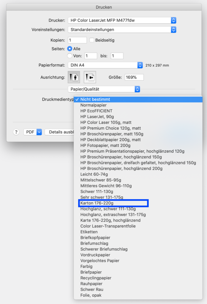 Beim Ausdruck auf Folie habe ich die Sattleford Transparente Laser-Klebefolie getestet. Diese Klebefolie ist auf eine Trägerfolie montiert damit sie nirgends, insbesondere nicht im Inneren des Druckers, ungewollt festklebt. In dieser Konstellation ist ein Folienblatt satte 150 µm dick. Ich musste erst verschiedene Druckmedientypen im Druckertreiber meines iMac ausprobieren, bis ich dann mit «Karton 176-220 g» eine ausreichende Fixierung des Toners auf der Folie und damit Wischfestigkeit erzielen konnte.