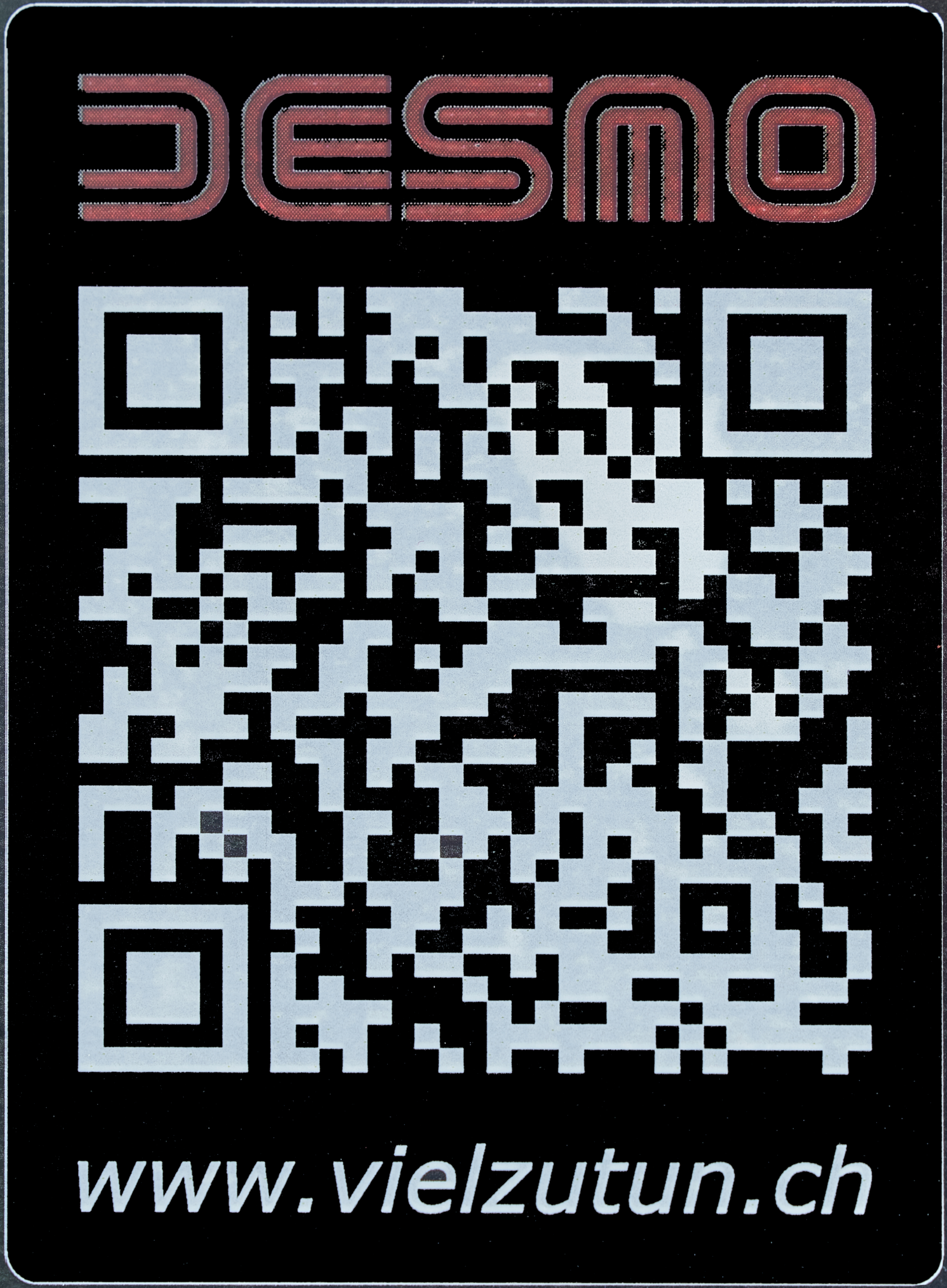 Meine ursprüngliche Anforderung lautete «Weissdruck auf transparente Klebefolie zum Aufkleben auf dunkle/schwarze Untergünde». In dieser strengen Auslegung liefert die Profi-Lösung das überzeugendere Ergebnis: Deren QR-Code ist trotz erheblicher(!) Form-Untreue ausreichend gut lesbar, und der Rotdruck des «DESMO»-Schriftzuges bei Tageslicht bei Weitem besser erkennbar als beim Ausdruck auf einem Farblaserdrucker der Consumer-Klasse.
