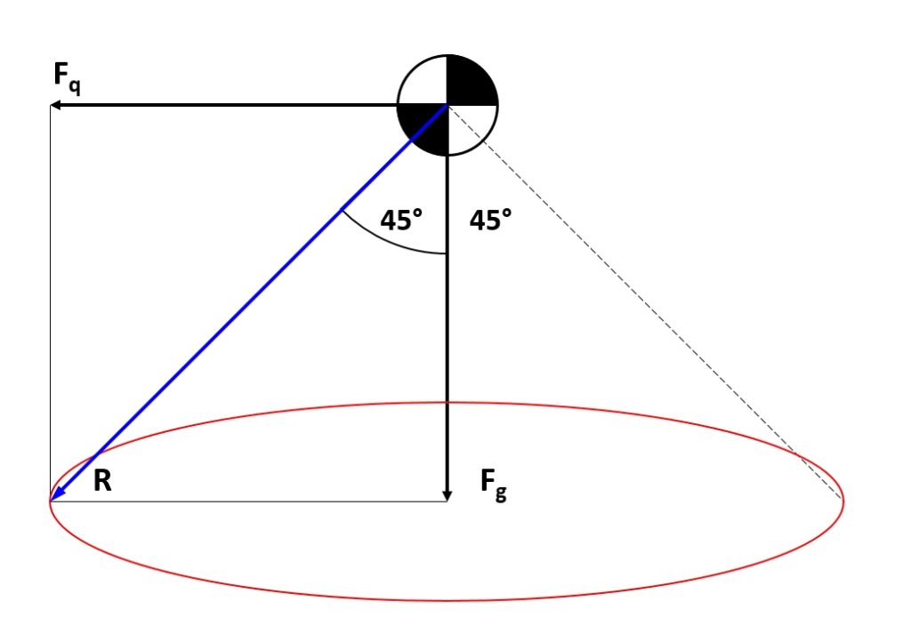 Die Schönheit dieser Annahme besteht darin, dass Gewichtskraft Fg und maximal übertragbare Querkraft Fq in diesem Fall betragsmässig gleich sind, woraus sich eine „Zweirad-äquivalente“, maximale Schräglage von 45° ergibt.