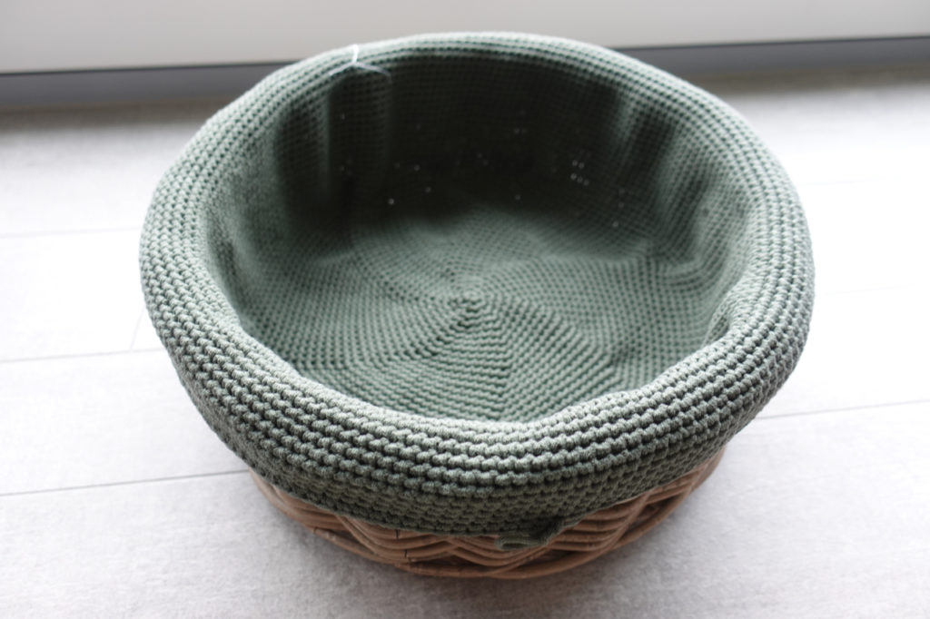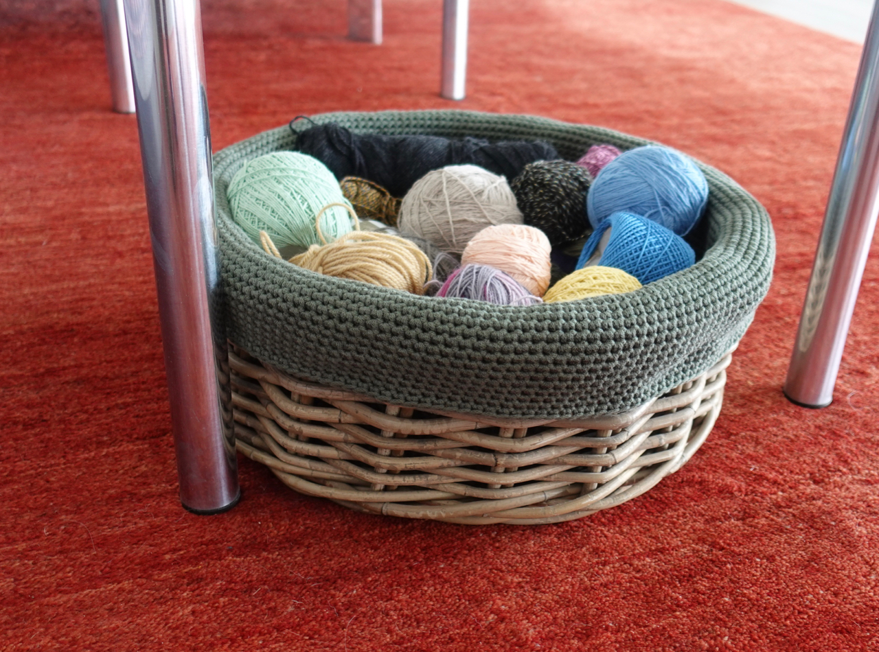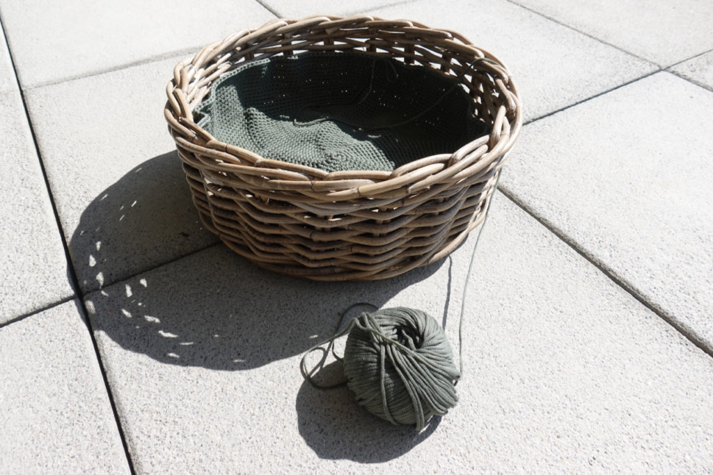 Aber das war einfach so stillos und hat mich immer wieder geärgert. Dann habe ich in Pinterest per Zufall gehäkelte Körbe entdeckt und das war der Startschuss für die Korbhülle. Ich hatte noch einen Posten «Vento» von Lana Grossa. Der würde sich wunderbar dafür eignen.