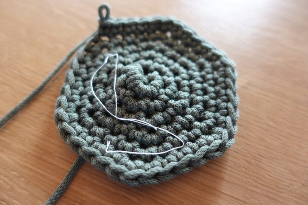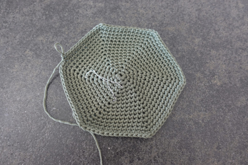 Schnell waren die ersten Runden gehäkelt. Ich habe die Aufnahmen immer am gleichen Ort gemacht, dadurch entsteht ein Sechseck. Bei diesem Korb stört das aber überhaupt nicht, da die Hülle problemlos eingepasst werden kann. Bei glatter Fläche müsste auf die Rundung geachtet werden.