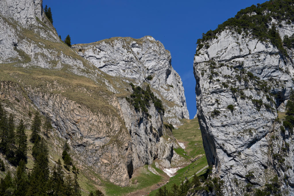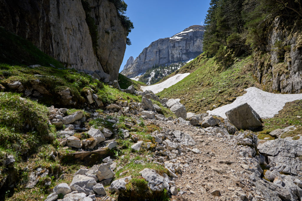 Nach dem Fälensee ging es steil am Fels vorbei bergab. Zum Teil eine richtige Schotterpiste und aufpassen war angesagt. Da sich der Weg grösstenteils im Schatten befindet war es teilweise auch noch ein bisschen feucht.