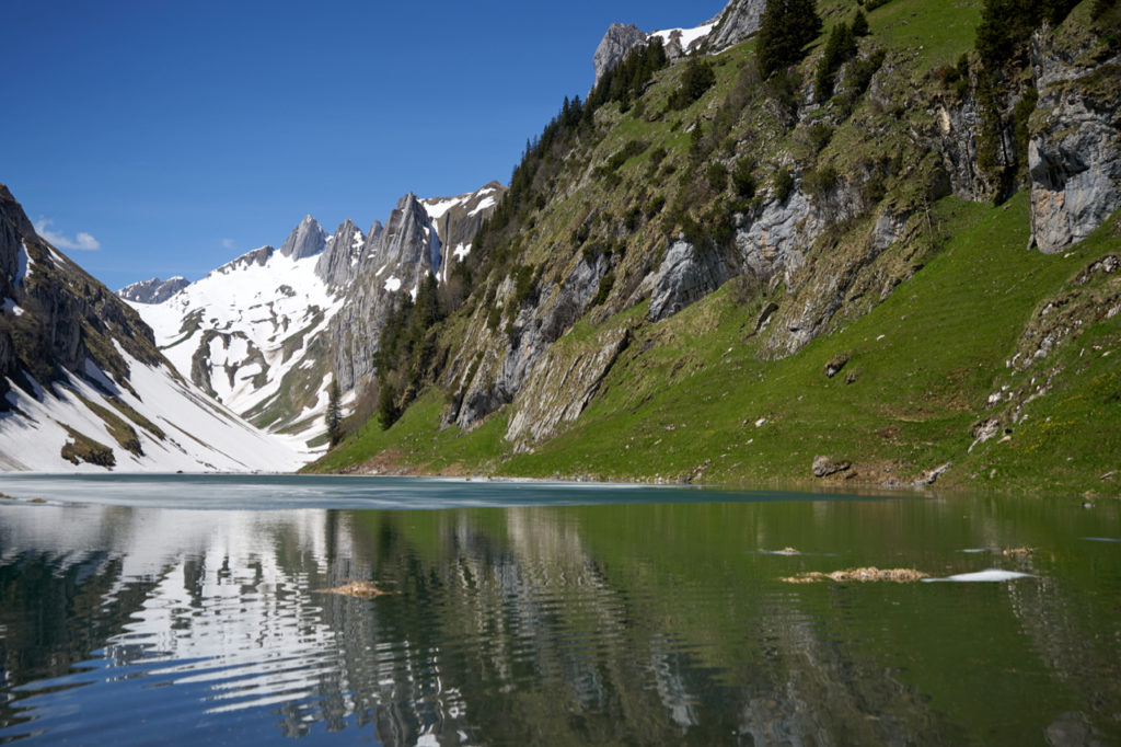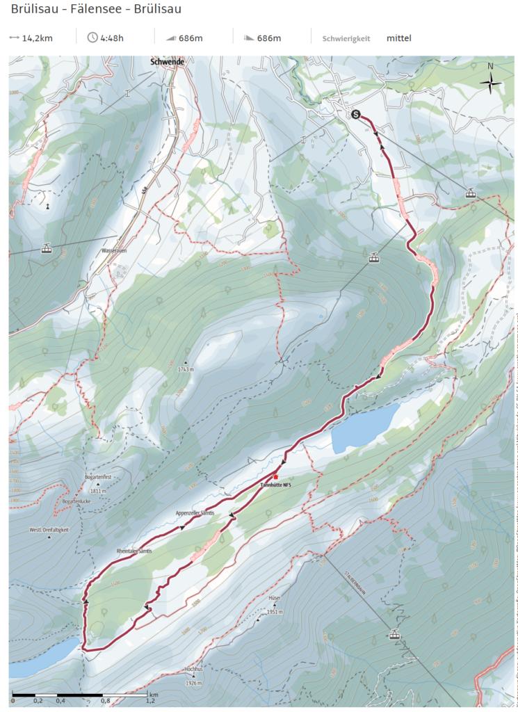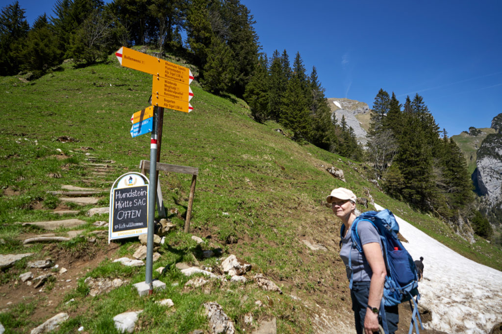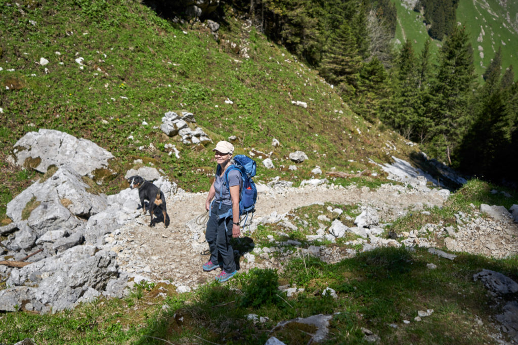 Da wir letztes Jahr ein paar Mal mit Schneefeldern gekämpft hatten, wurden nun auch noch die Schneeschuhe eingepackt. Sicher ist sicher. In Brülisau angekommen, fragte ich doch erst noch den Parkplatzeinweiser, ob am Fälensee noch Schnee läge, wegen der Schneeschuhe. Nein, nein alles sauber kein Problem, braucht ihr nicht. Na also, ein bisschen Gewicht weniger.