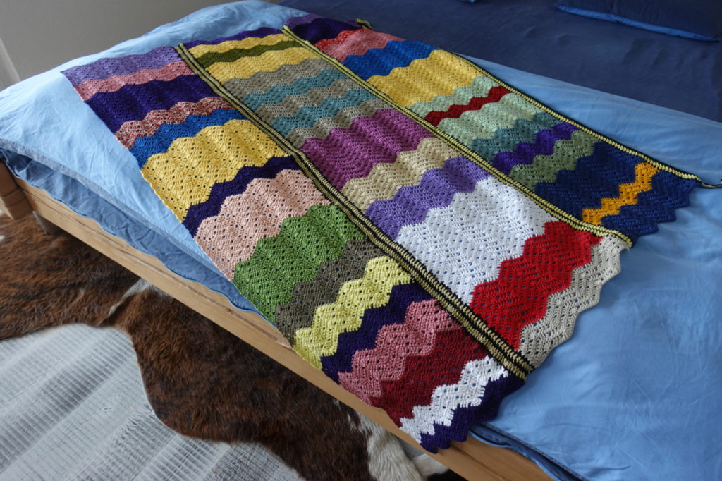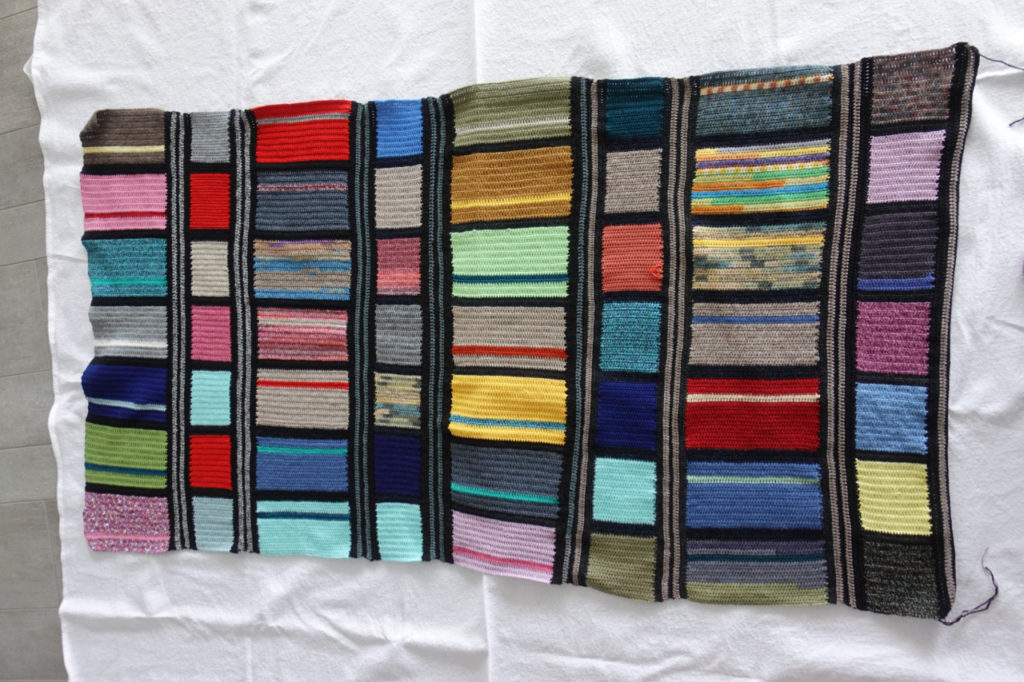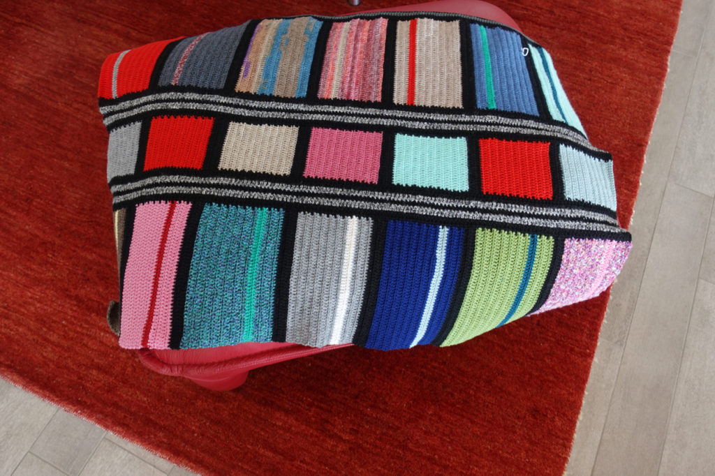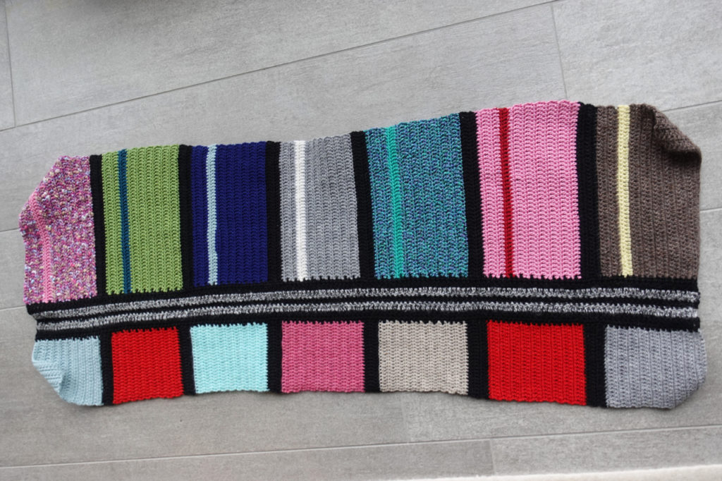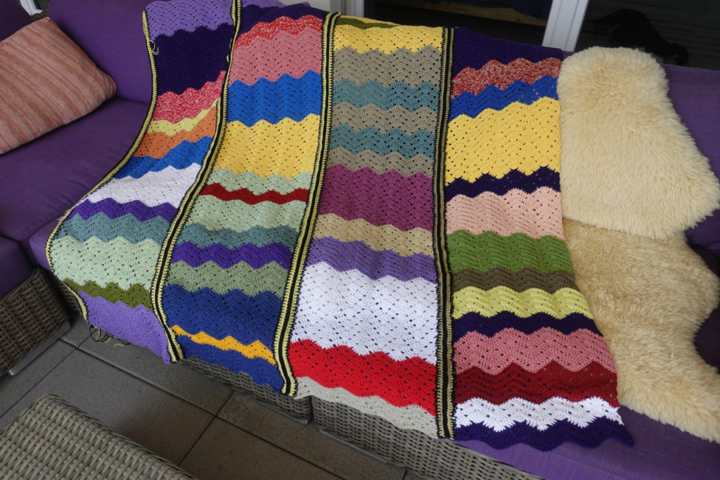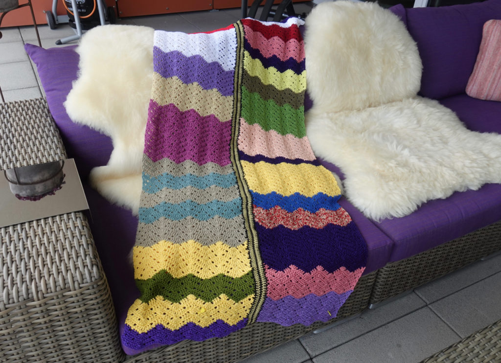 Die Grösse der Decke ist ca. 130 x 180 cm und ich habe rund 2,5 kg Wolle und Garn verbraucht. Gehäkelt wurde immer eine Reihe Stäbchen und eine Reihe feste Maschen. Mit den vielen verschiedenen Materialien konnte ich meiner Phantasie natürlich freien Lauf lassen und das hat echt Spass gemacht.
