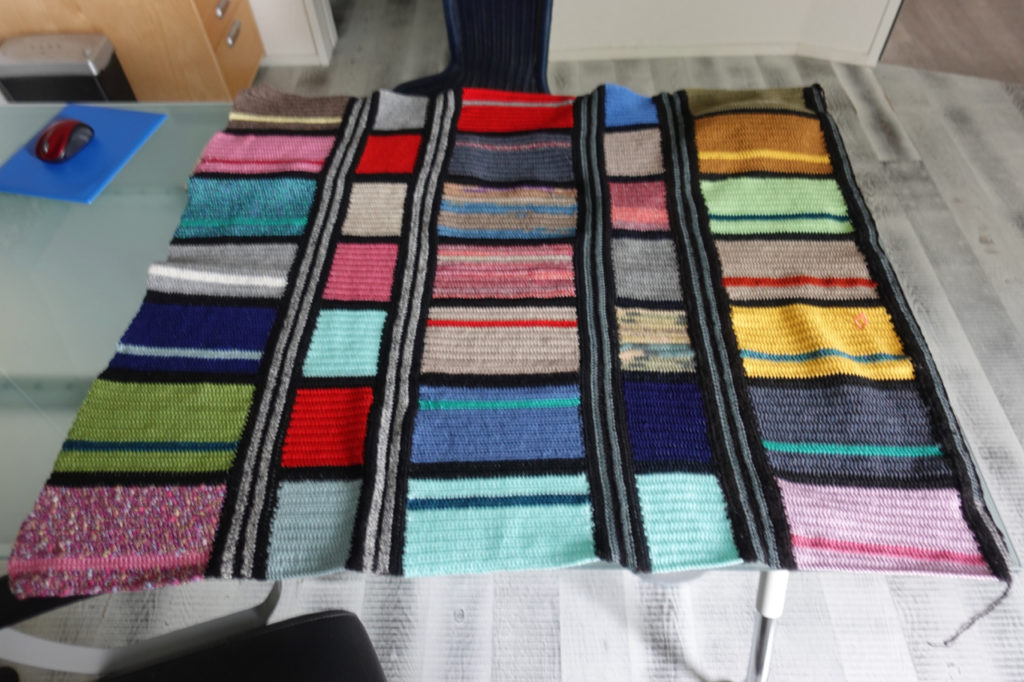 Kolleginnen in unserer Handarbeitsgruppe stricken immer wieder aus Resten von Sockenwolle Decken, welche als Wärmespender über die Knie beim Rollstuhl verwendet werden. Wäre etwas, aber ich wollte ja auch die vielen vorhandenen Garne verwenden und die sind dafür leider nicht geeignet.