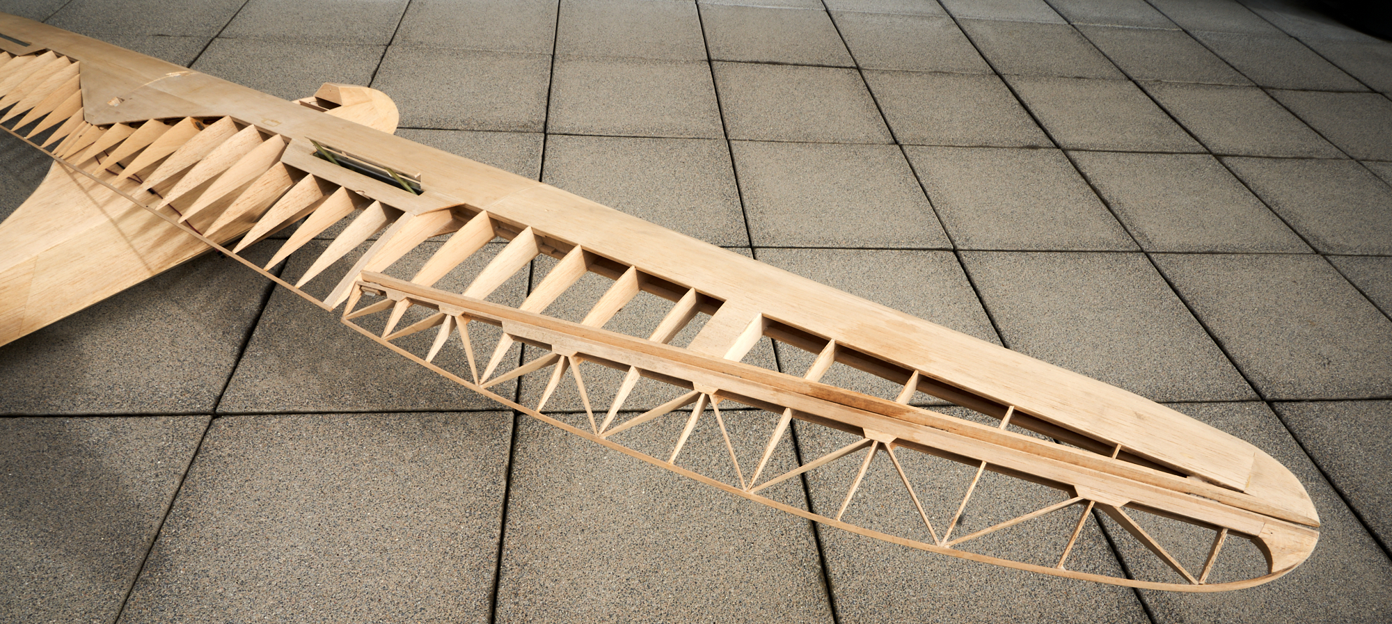 Hier der Rumpf, mit Vorbereitung für den Einbau einer Funkfernsteuerungsanlage. Die Seitenwände übrigens in einer Balsa-Sperrholz-Balsa Sandwich Konstruktion: