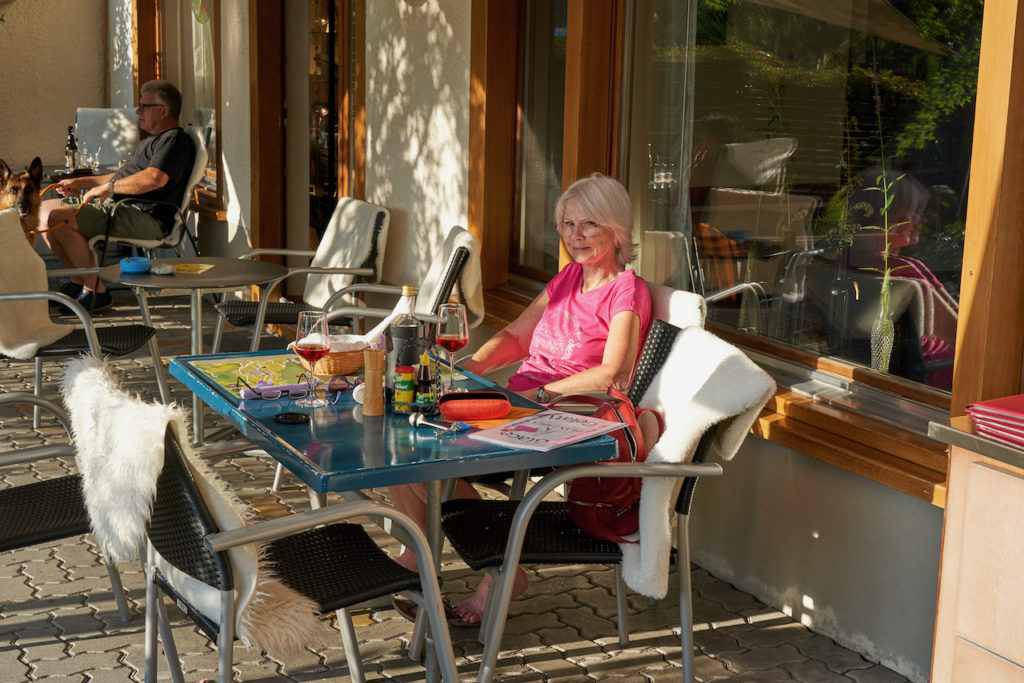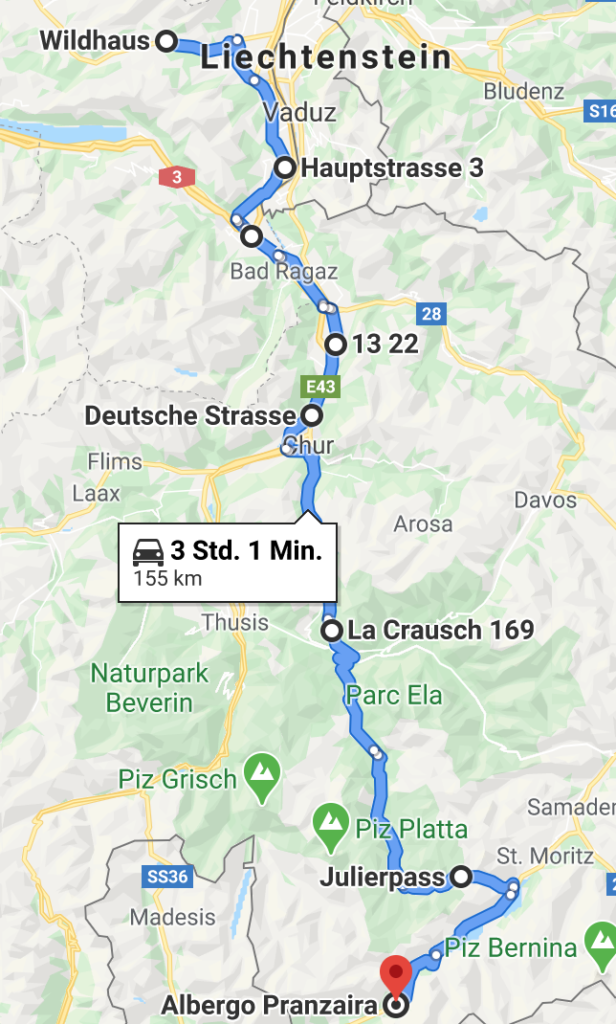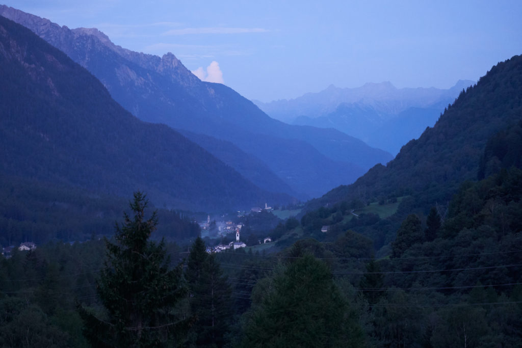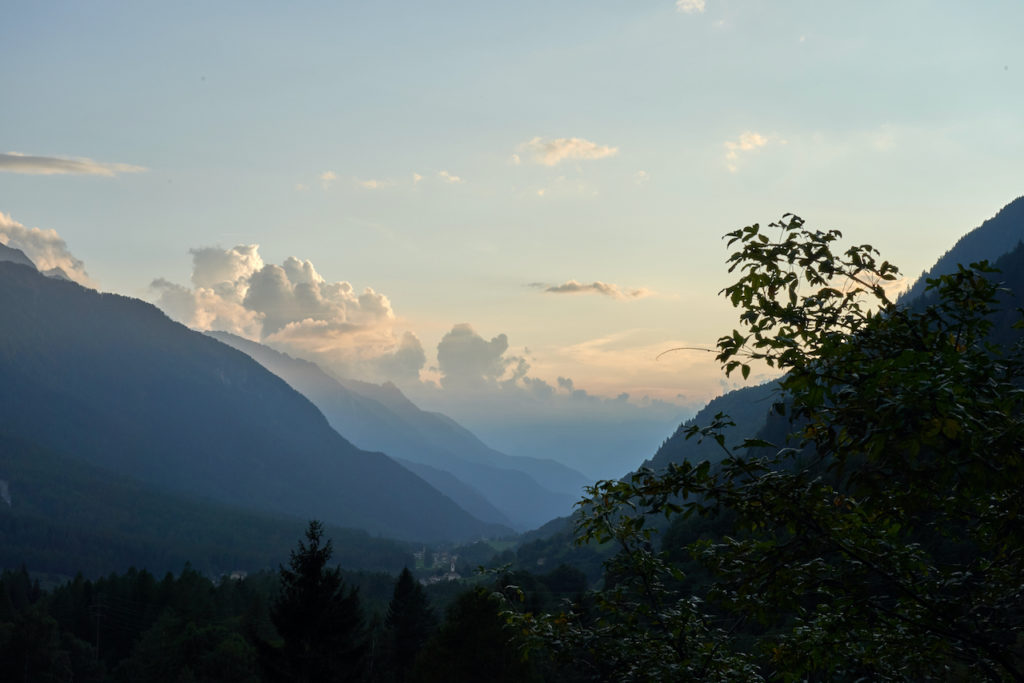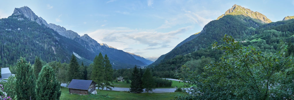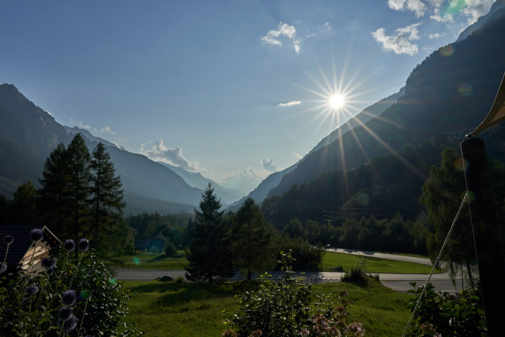 In spektakulären Serpentinen schlängelten wir uns den Malojapass hinunter Richtung Bergell. Kurz vor Vicosoprano fanden wir ein hübsches kleines Hotel, die Albergo Pranzaira. Nach dem Zimmerbezug liessen wir uns auf der stimmigen Gartenterrasse nieder und genossen den Abend.