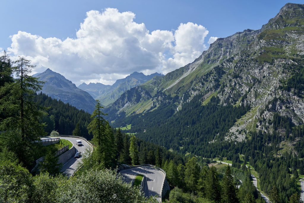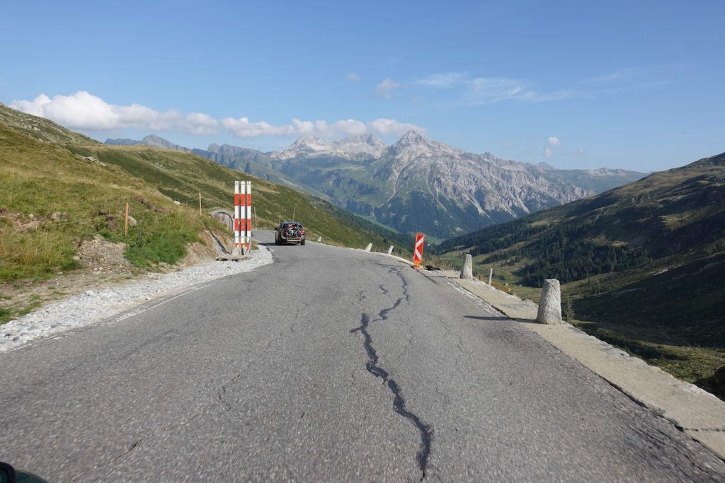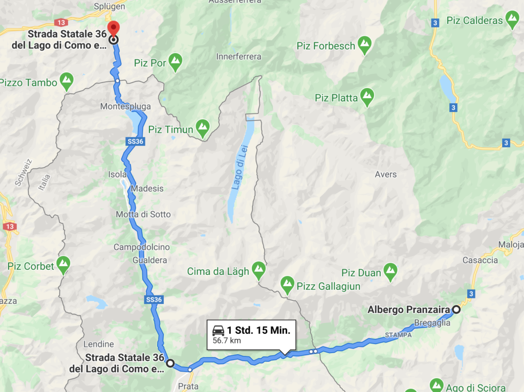 In Chiavenna IT erreichen wir mit 325 m.ü.Meer den tiefsten Punkt unserer kleinen Reise, und wenden uns wieder nach Norden, in Richtung Schweiz. Wir waren ja so gespannt auf die Strecke Richtung Splügenpass. Auf der italienischen Seite hatten wir auf unserer «Grand Tour of Switzerland» vor drei jähren mit der Ducati die haarsträubenden Nadelkurven in den unbeleuchteten Galerien und Tunnels kennen und fürchten gelernt. Eng, dass kaum zwei PW’s Platz haben, unbeleuchtet, echte Spitzkehren, schon ein bisschen krass.