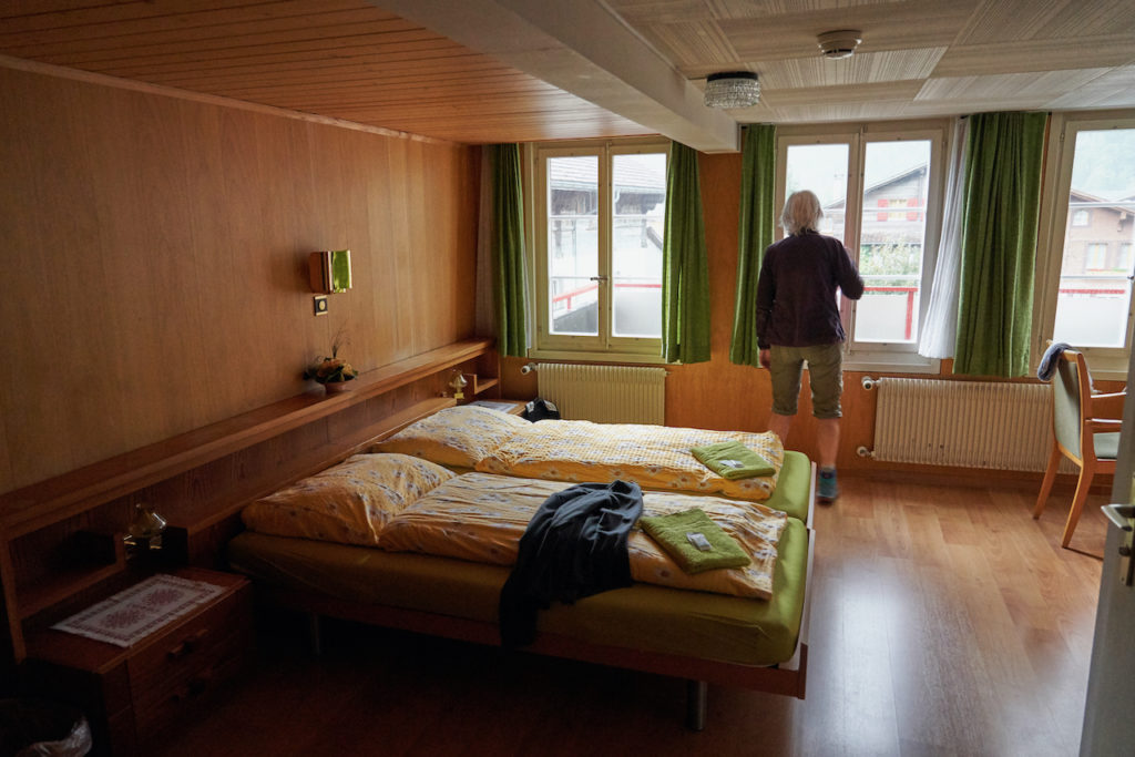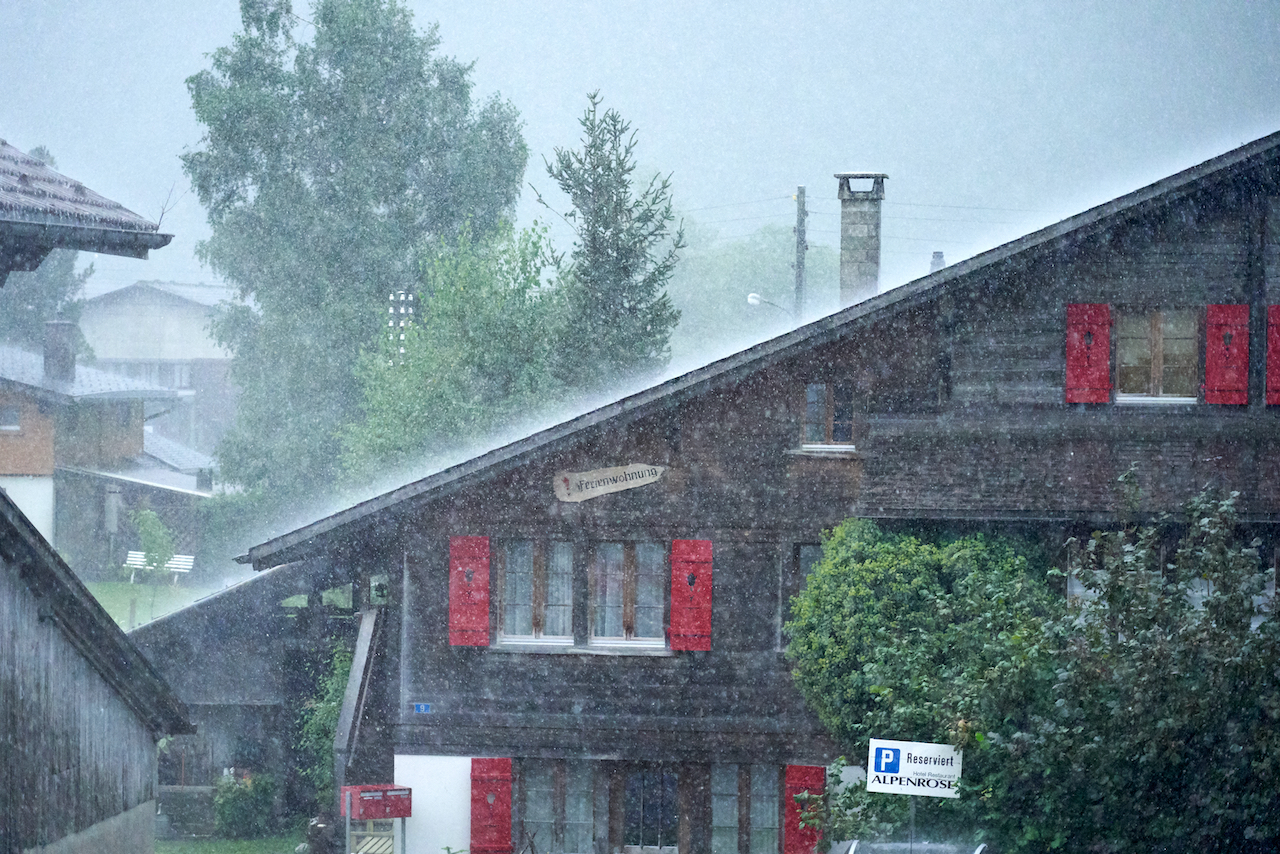 In Innertkirchen ging es dann richtig los, der Wind brauste durch die Gegend, die Beizer brachten notfallmäßig Schirme und Gartenmöbel in Sicherheit, und ich machte mich aufgrund eines Tips im Laufschritt zu Fuss auf die Piste. Glück gehabt, ich erwischte gerade noch das letzte Zimmer im Hotel Alpenrose. Das grosse Plus war, wir konnten auch das Gespann in einen trockenen Unterstand stellen. Das freute uns natürlich umso mehr nachdem wir dann ein paar Minuten später aus der Sicherheit eines trockenen Zimmers miterlebten, wie der Himmel seine Schleusen öffnete.