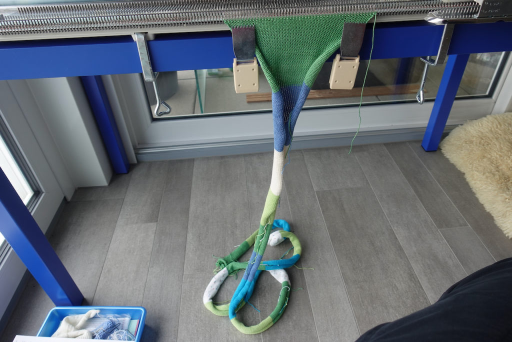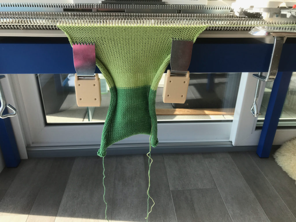 Aber hallo! Auf der Strickmaschine verhält sich das Gestrickte schon etwas anders. Das habe ich dann bei meinem Übungsstück schnell mal gemerkt. Aber ich mag es überhaupt nicht, etwas wieder aufzumachen, deshalb habe ich mich immer weiter «durchgewurstelt» 😉.