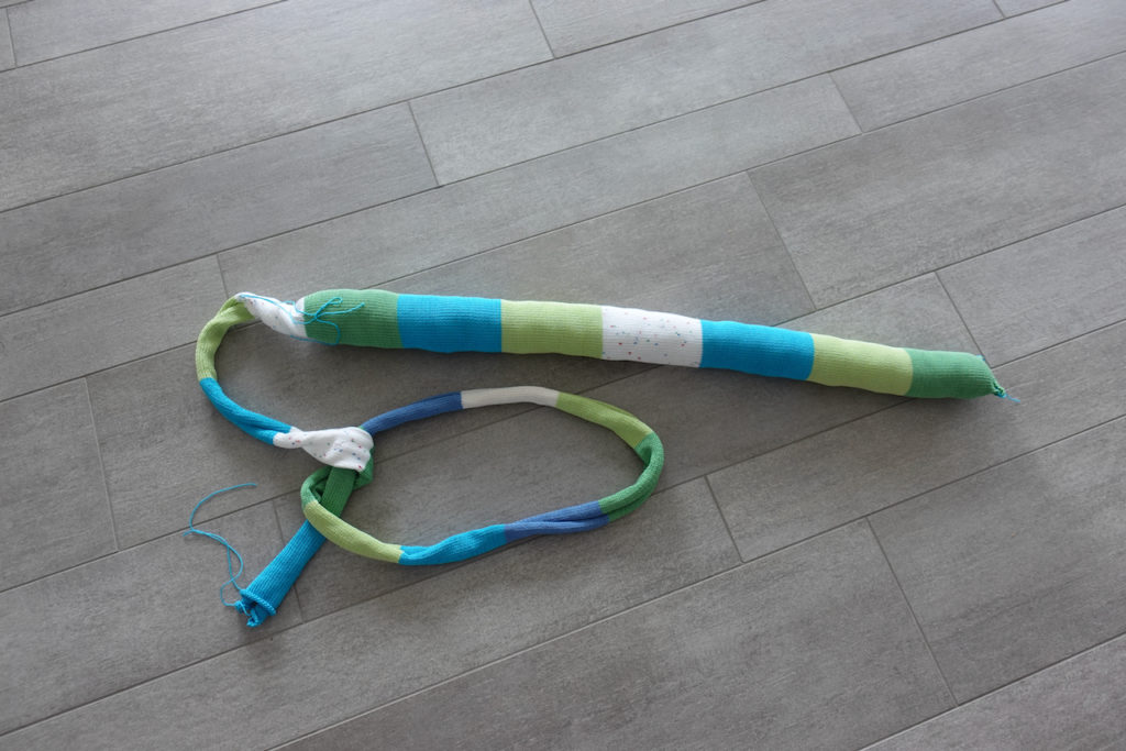 Die grosse Herausforderung war das Zusammenführen zu einem schönen Knopf. Ich hätte fast die Geduld verloren. Der Knopf wurde einfach nicht so schön und die Wurst war einfach zu dünn und viel zu lang. Am liebsten hätte ich es in die Tonne geschmissen. Zum Glück hat mir da mein «privater Haus-Ingenieur Chris» tatkräftig geholfen. Nachdem ich den Schlauch um ein gutes Stück kürzer gemacht hatte, konnten wir es dann doch in eine einigermassen ansehnliche Form bringen.