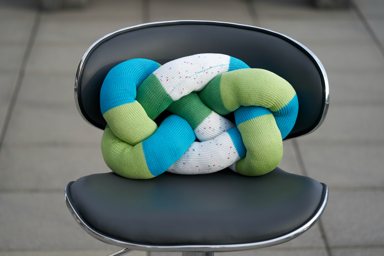 Ich hatte bei Filati so ein hübsches Knopfkissen – Knopf = Knoten – gesehen. Da musste man einfach nur eine lange Bande stricken, keinerlei Komplikationen, ab und zu einen Farbwechsel, das sollte ich doch zustande bringen.