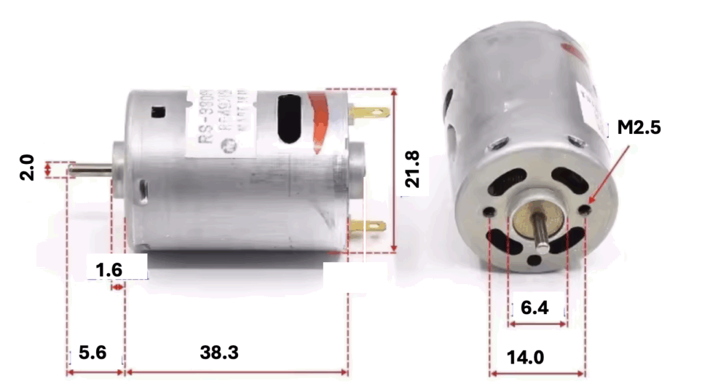 Update 01.04.2026 zur elektro-magnetischen Kompatibilität: Der Motor enthält einen 3-poligen Anker mit ø15.04 mm, Länge Blechpaket 21.5 mm, reine Achslänge 50.5 mm, Achstummel beidseitig ø2.0 mm und D-förmig abgeflacht, Länge Achstummel abtriebsseitig ab axialer Anlagefläche 6.6 mm, Länge Achstummel ab axialer Anlagefläche Kollektor 8.3 mm. Jeder «Zahn» des 3-poligen Ankers ist mit 107 Windungen Kupferdraht ø0.22 mm umwickelt.