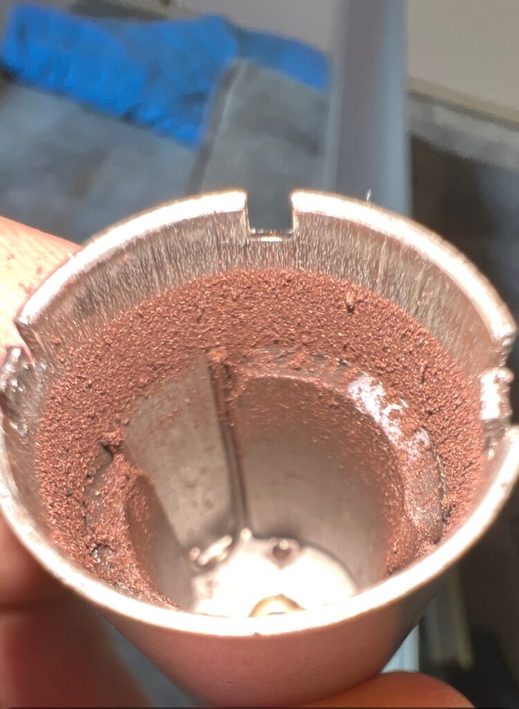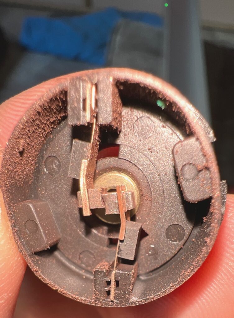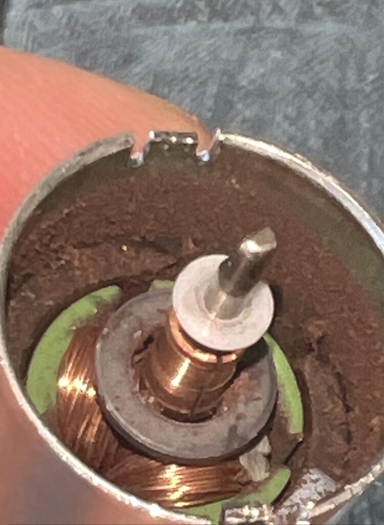 Auffallend ist der massive Abrieb vom Kollektor des Ankers, der sich grossräumig im Inneren des Motors verteilt hat. Ein Abrieb, dessen Konsistenz ich weniger als «Staub», sondern vielmehr als regelrechte «Späne» bezeichnen würde. Eigentlich sollten die «Bürsten» bzw. «Kohlen» aus Graphit bestehen und extrem reibungsarm auf den Kontaktflächen des Kollektors gleiten. Dem Schadensbild nach zu urteilen sind die angeblichen «Kohlen» (Bild unten links) jedoch wesentlich härter als die kupfernen Kontaktflächen des Kollektors. Ein Umstand, welcher eine extrem endliche Lebensdauer des Motors quasi garantiert 😳